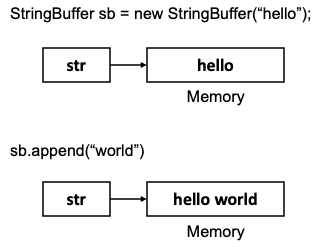 StringBuffer나 StringBuilder의 경우 문자열 데이터를 다룬다는 점에서 String 객체와 같지만, 객체의 공간이 부족해지는 경우 버퍼의 크기를 유연하게 늘려주어 가변적이라는 차이점이 있습니다.