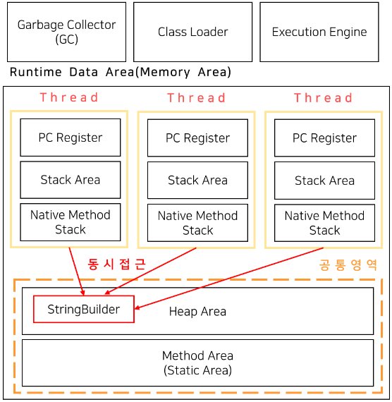 ▶ StringBuilder 클래스는 쓰레드에서 불안전합니다. ( thread unsafe )